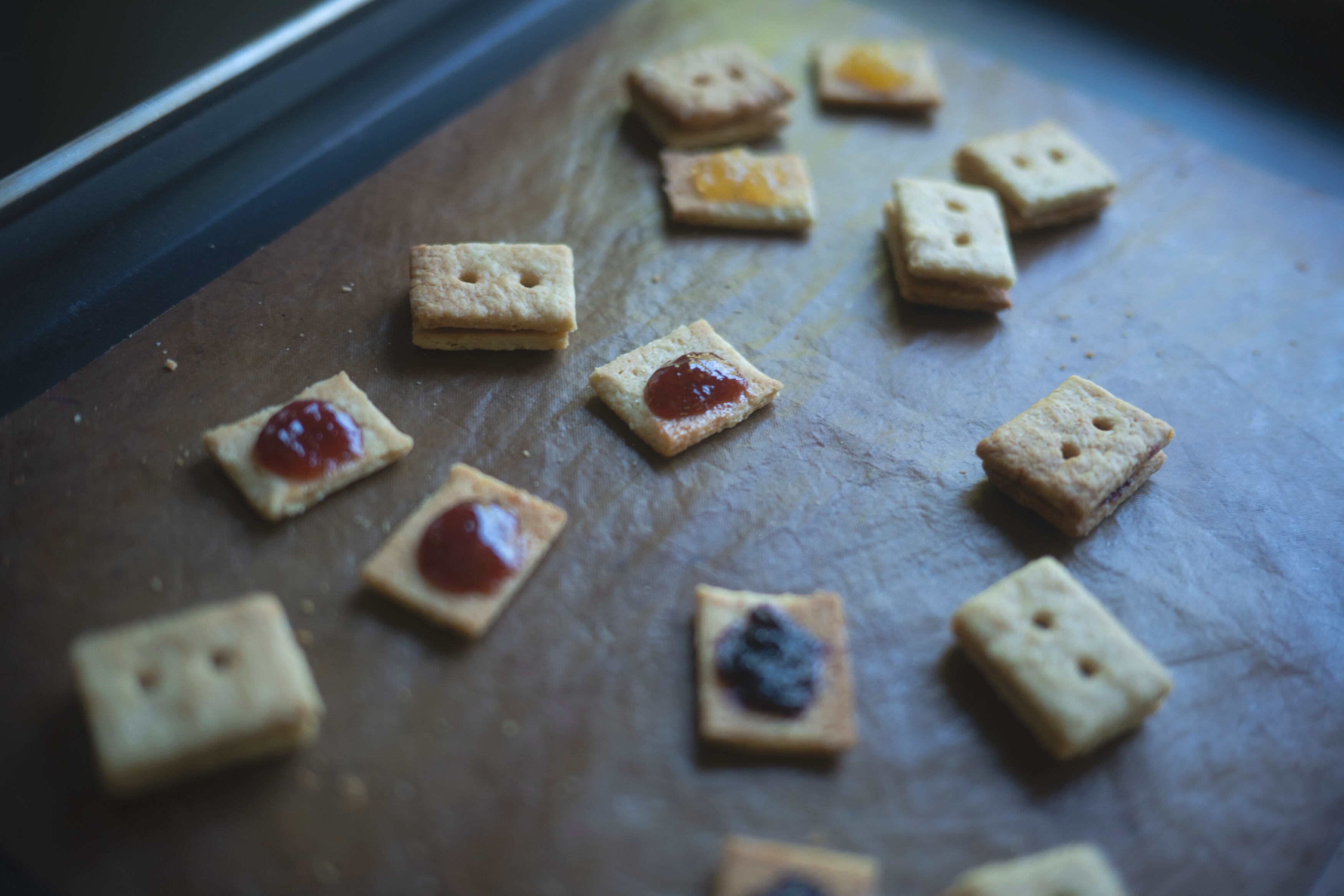 地元で採れた果実をつかった3種(いちご・ブルーベリー・りんごスパイス)のジャムをサンドしました。27枚入り。